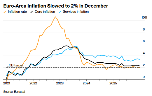 欧盟统计局的初步统计数据显示,去年12月,欧元区消费者物价同比上涨2%,较前一月的2.1%有所回落,且与经济学家的预测值完全吻合。剔除波动较大的食品和能源价格后,核心通胀率放缓至2.3%;备受市场关注的服务业通胀率同样出现下行趋势。