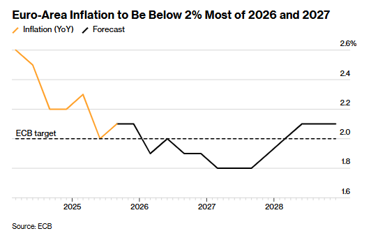 在2025年最后一次货币政策会议上,欧洲央行预计,今年通胀率仅会小幅低于目标水平,较此前预测有所上调,反映出服务业成本的放缓速度低于预期。