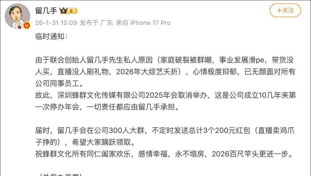 1月31日,微博粉丝超1300万的知名大V,曾参加热播综艺《再见爱人4》出圈的留几手发布微博称,深圳蜂群文化传媒有限公司2025年会取消举办。