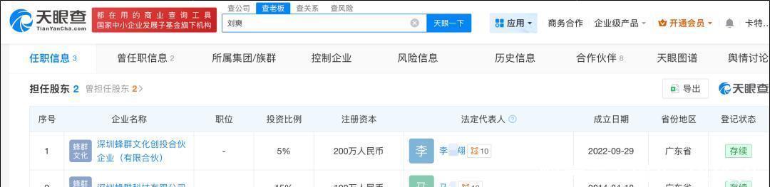 天眼查显示,留几手(本名刘爽)持有蜂群两家公司的股权,分别为【深圳蜂群科技有限公司】、【深圳蜂群文化创投合伙企业(有限合伙)】。